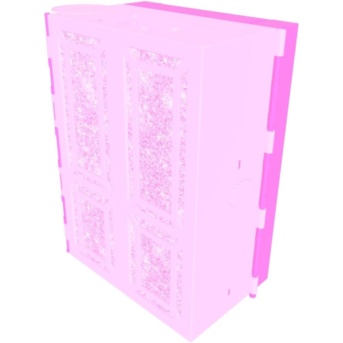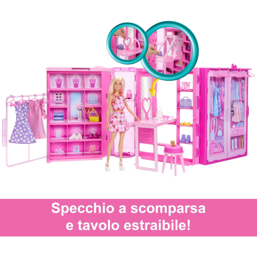 Il guardaroba rosa glitterato si apre su un playset largo 91 centimetri con una bambola Barbie, oltre 25 pezzi, oltre 20 scomparti, 2 appendiabiti, una parete per scarpe e molto altro ancora.