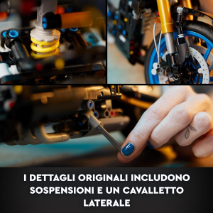 Per rendere ancora più realistico questo iconico modello LEGO Technic per adulti, sono presenti uno sterzo funzionante tramite input nel manubrio e un cavalletto laterale
