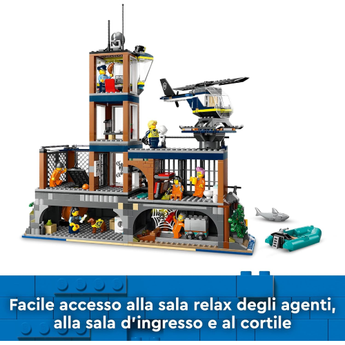 Cosa offre questo set LEGO? Un’isola-prigione costruibile con scogliera, prigione, barca della polizia LEGO, gommone, elicottero giocattolo, 3 minifigure di agenti, 4 prigionieri, un cane poliziotto e uno squalo