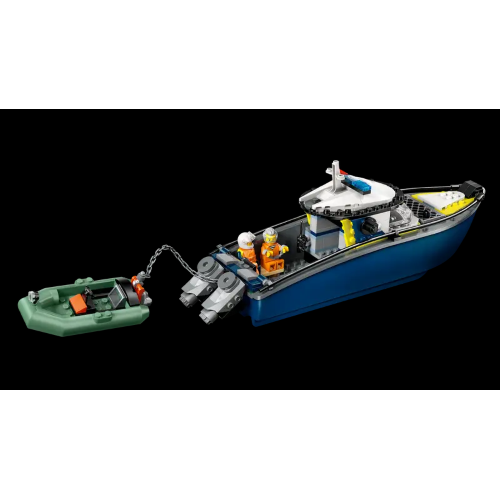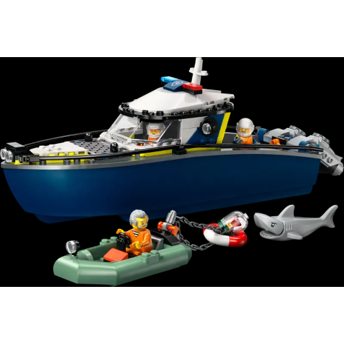 Cosa contiene la scatola? Tutto il necessario per tanto divertimento: 2 veicoli LEGO, un motoscafo della polizia e un gommone a motore, oltre a 2 minifigure di agenti di polizia, una minifigure di ladro e uno squalo giocattolo