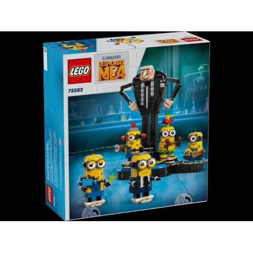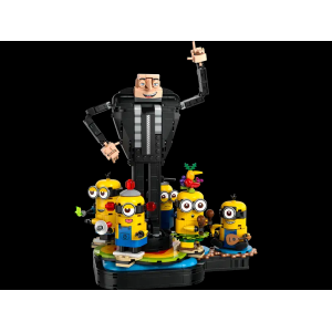 La grande figura di Gru è dotata di braccia, mani e dita snodabili che i bambini possono muovere nelle pose preferite. Ci sono 5 personaggi dei Minions costruibili: Jerry con maracas e cappello alla frutta, l’agente segreto Dave con una elica in testa e walkie-talkie, Beedoo Minion con un megafono, Mel che suona l’ukulele e Kevin con la sua pistola-scoreggia. I Minions sono posizionati su una piattaforma rotante e quando i bambini girano il Minion seduto, gli altri Minion ballano attorno al loro capo sorridente! Ogni Minion può muovere le mani e tenere in mano gli accessori. Le loro teste sono mobili e gli occhi possono essere cambiati per creare espressioni diverse. I bambini possono rimuovere 4 Minions dal supporto per esplorare ulteriori possibilità di gioco.