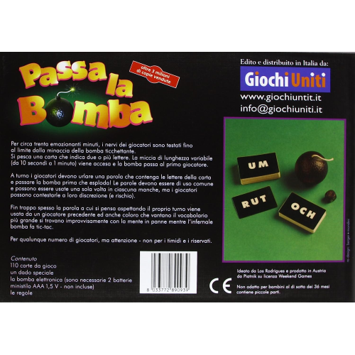 Un mazzo di 110 carte fronte/retro con le sillabe e una bomba con una miccia variabile tra i 10 e i 60 secondi… e tanto basta per trascorrere tanti momenti esilaranti.