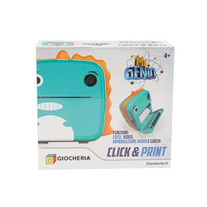 Macchina fotografica dinosauro con fotocamera anteriore e posteriore. Tantissimi effetti e cornici per le tue foto, da salvare o stampare. Funzioni: foto, video, riproduzione audio, e giochi.