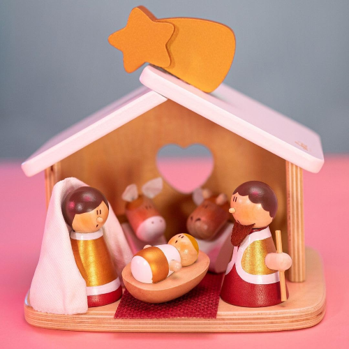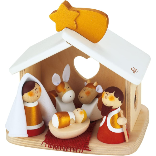 Giuseppe e Maria vegliano sul Bambino in una capanna illuminata dalla stella cometa