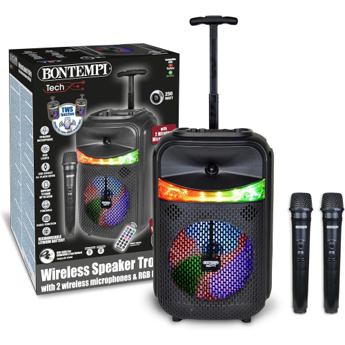 BONTEMPI 49 1070 Cassa Trolley Acustica Wireless con 2 Microfoni, Luci RGB, Telecomando, Display, Funzione TWS, 39x22x19 cm