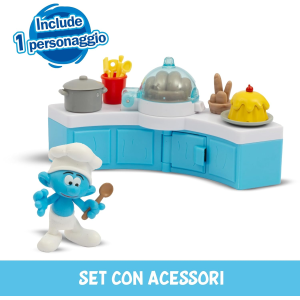 Mini Playset Puffi con accessori e puffo incluso. Scegli la Cucina di Puffo Chef, con la cloche del pane e l'antina apribile.
